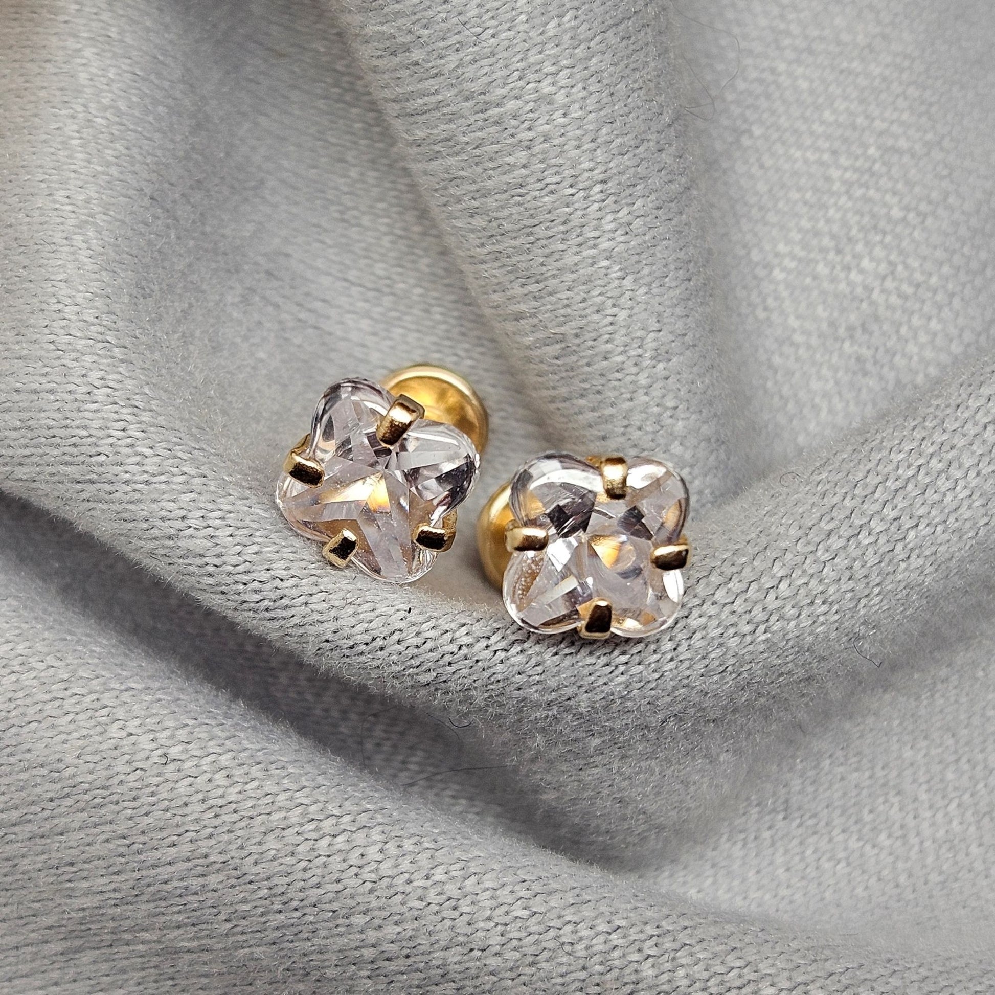 Unique and dainty, these 10K gold square zirconia flower studs add a subtle sparkle to your everyday look, perfect alone or paired with hoops to elevate any style. Featuring screw-backs for a secure fit, these earrings stay!