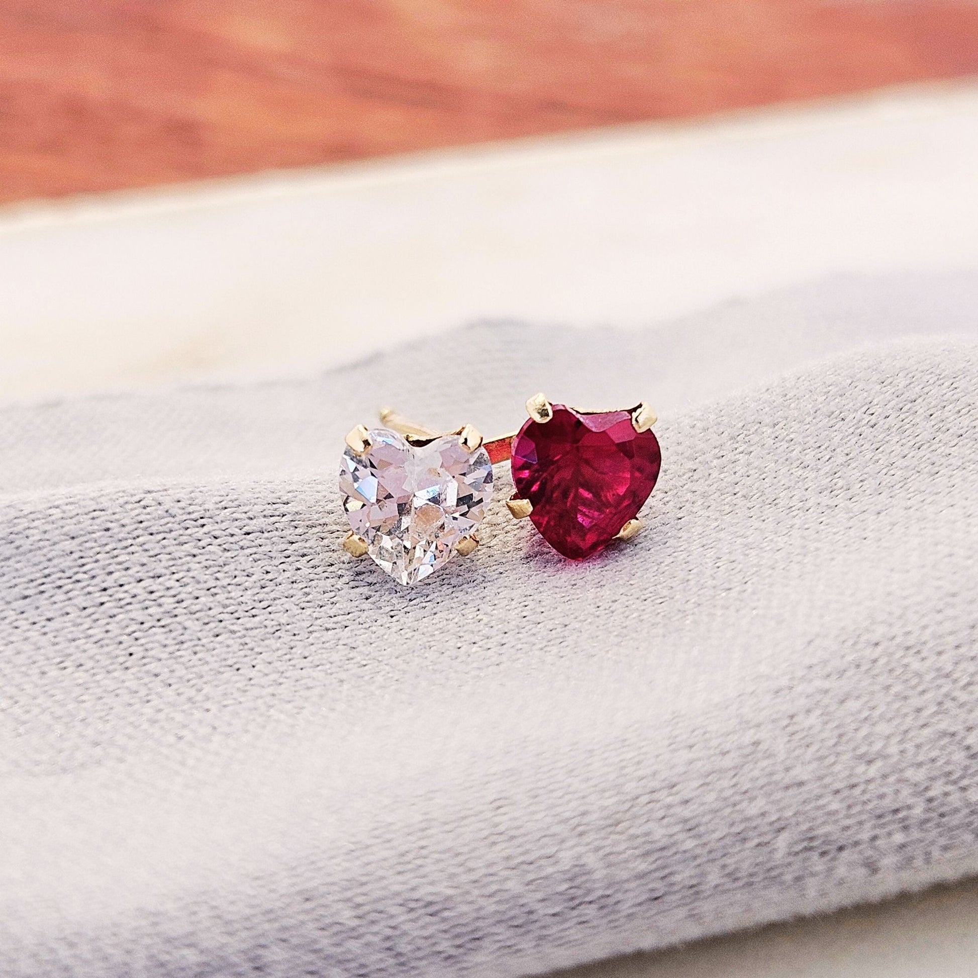Add charm and elegance to your look with these 10K gold stud earrings featuring two mini zirconia hearts, one classic white and one vibrant red. Perfectly balanced between timeless beauty and a playful pop of color, these lightweight, versatile studs are ideal for all ages and everyday wear.